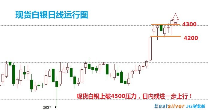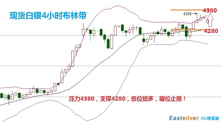 現貨白銀短多:4300附近做多,目標4380附近,止損4270,若銀價下破4270價位則多單堅決止損并保持觀望姿態!